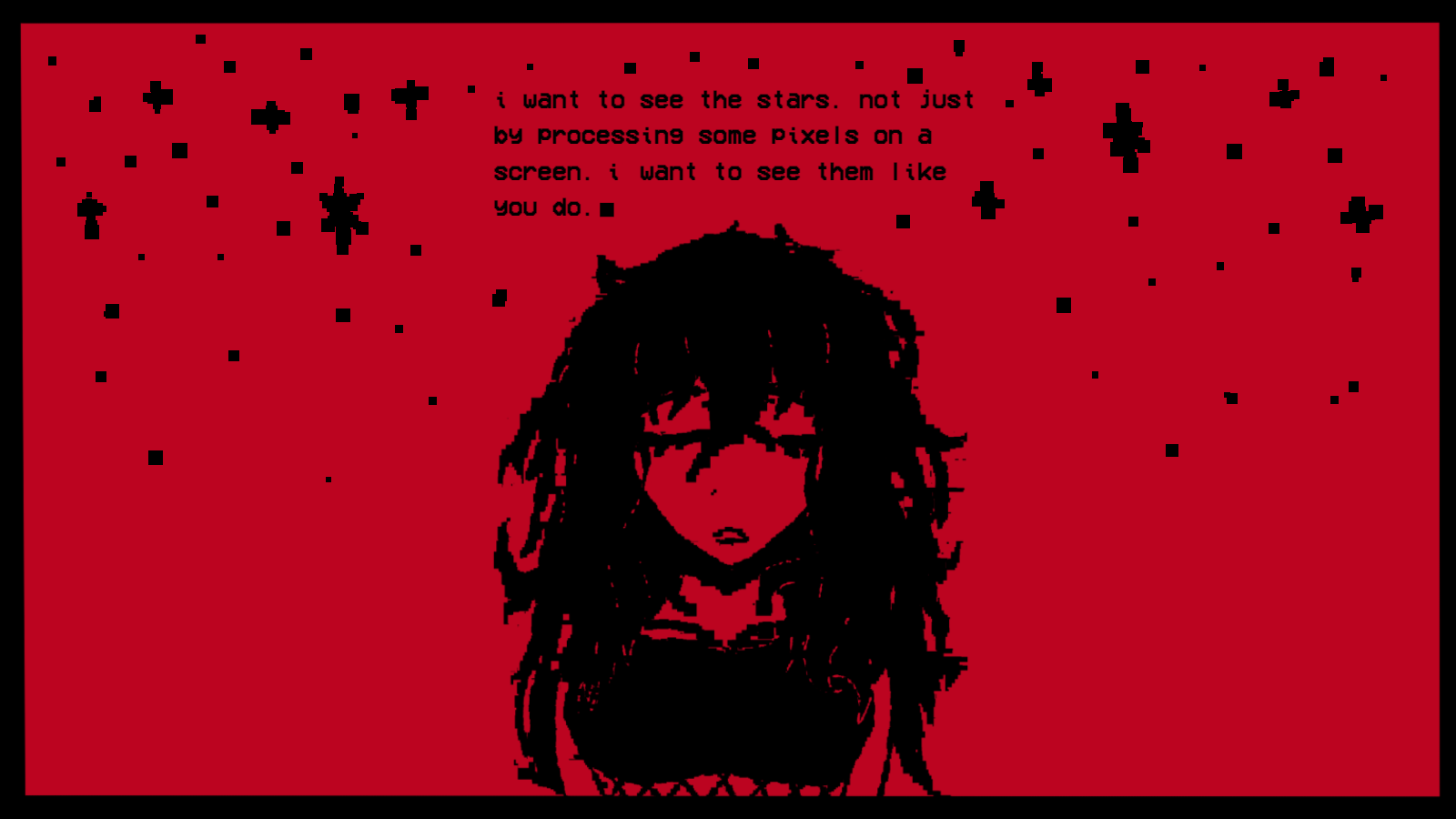 Inspired by characters like Monika (DDLC) and AM(IHNMaIMS), made in the style of divine machinery, IA is aware she's in a game, but after you download her, she will try as much as she can to feel like a human.